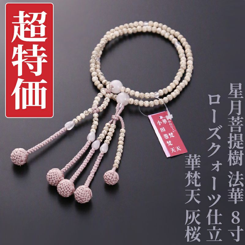 2個親珠の一方には2本の房がつき、房と親珠の間には少し小さい10個の弟子珠(でしだま)で作られた浄名(じょうみょう)と呼ばれるリング状の結び目があります。浄名は菩薩を象徴する珠とされています。もう一方の親珠には3本の房がつき、1本の房は他の房より少し長さが短く数取用とされています。こちらの房には浄名はありません。5本の紐の先には、糸を丸く束ねた菊房(菊梵天)、紐を編んだ梵天房や小田巻(おだまき)と呼ばれるいずれも毬(まり)状の飾りがつきます。
