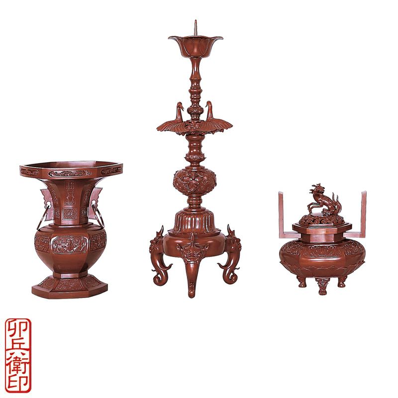 三具足 御本山六角型別製 蝋型鋳造 卯兵衛印(花瓶対辺18~27cm 4種類)
