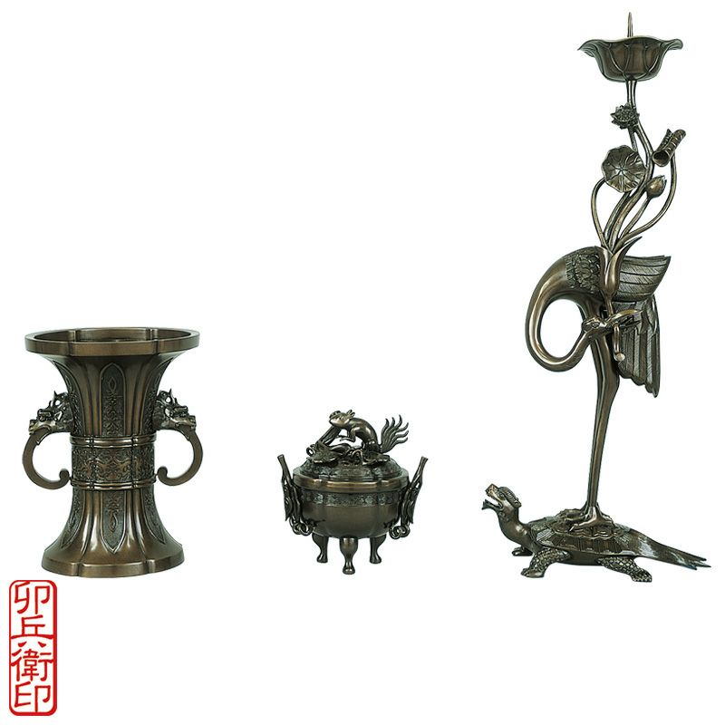 鶴亀型三具足 御本山阿弥陀堂型 蝋型鋳造 卯兵衛印 花瓶口径18cm(本願寺派)