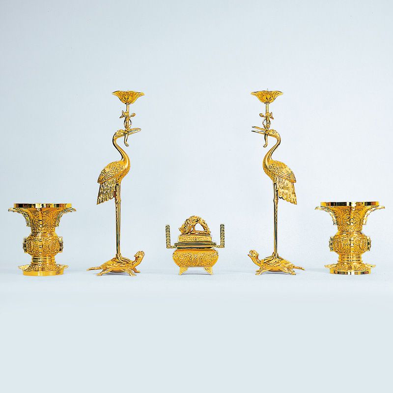 五具足 御本山御影堂様式 深彫入 真鍮製 磨き 花瓶口径24cm(佛光寺派)