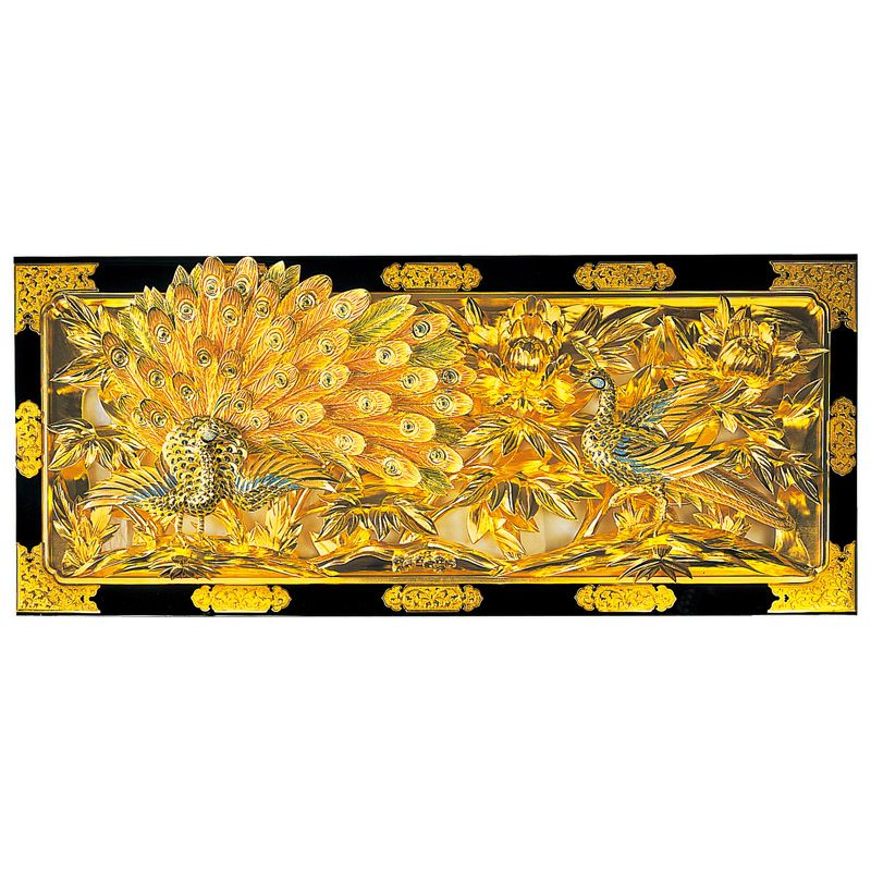 欄間 牡丹に孔雀彫刻入 本漆塗 純金箔押 框金具打 極上 基準寸法横幅157cm(各宗派)