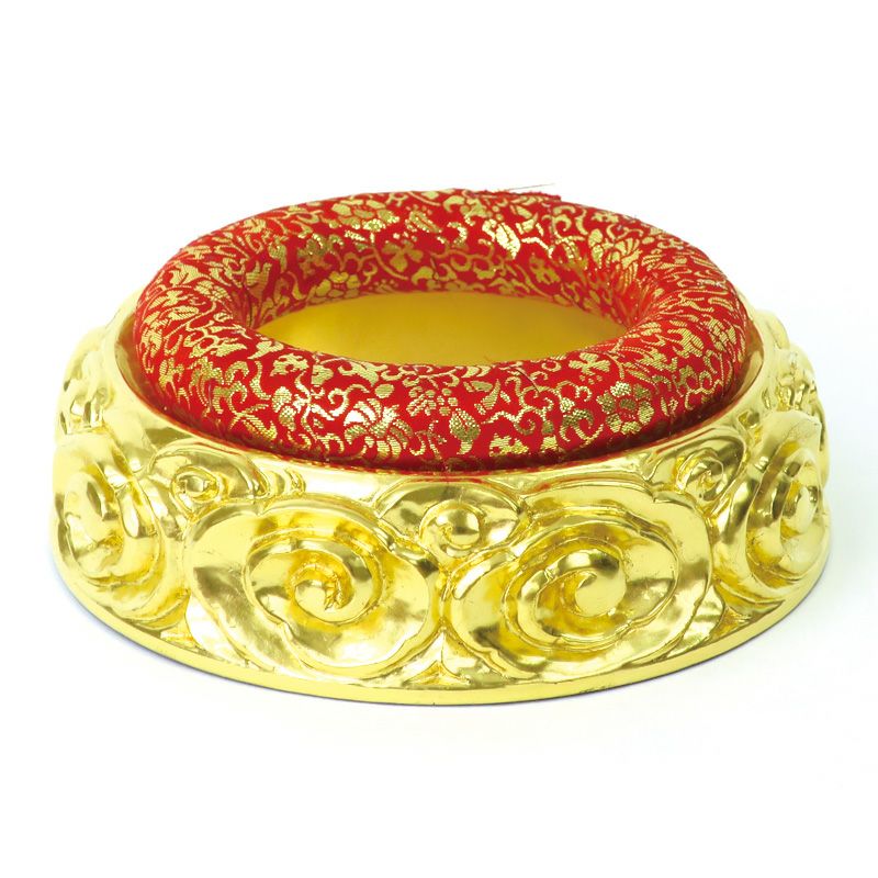 本願寺派は丸型もしくは六角型の鏧台を設け、布団を敷いた上に大鏧を乗せ、白革巻きの撥で打ち叩きます。大谷派では、方形または長方形の台に金襴を巻いた輪を乗せて経鏧を設置します。平鏧を乗せる場合は、雲彫りを施した木製の雲輪に金襴輪を設置し平鏧を乗せ、金襴巻の撥で打ちならします。