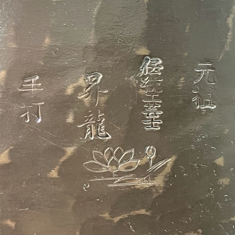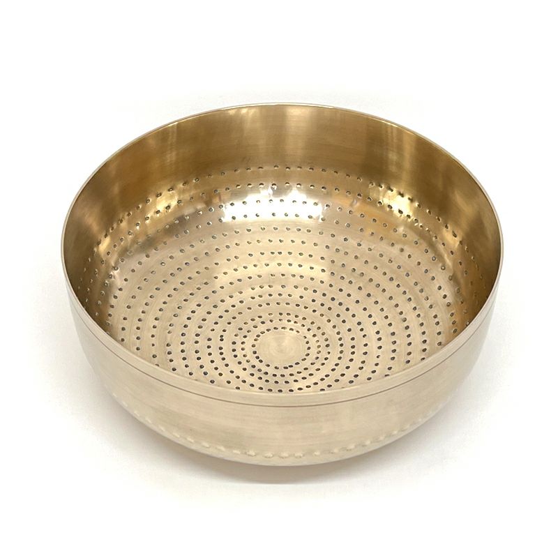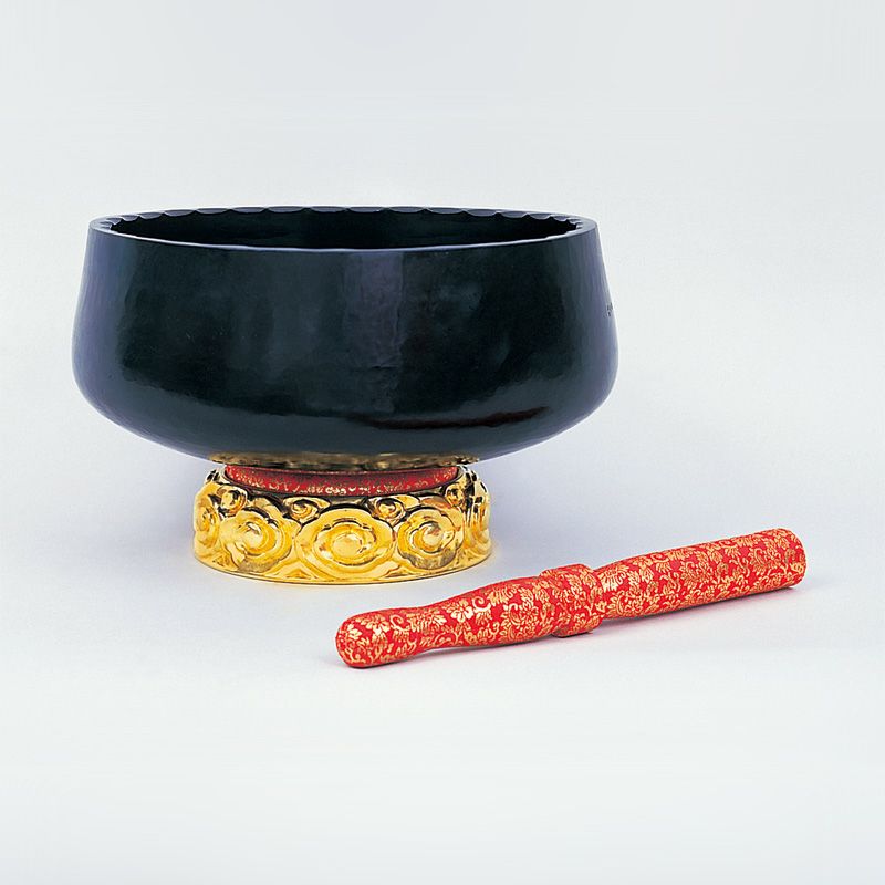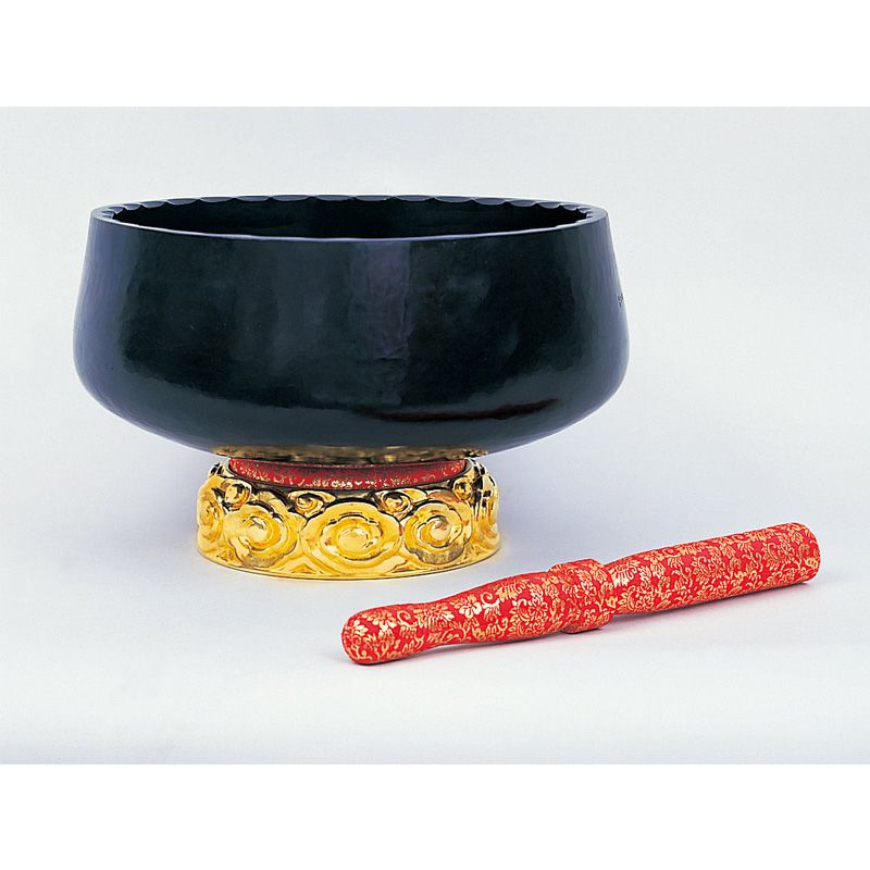 鏧は禅宗寺院に用いられていた法具の一種で、真鍮板を槌で打ち延ばして形成します。口の部分を少し厚く、底や側面は長い余韻を保つため薄くしているので、側面の低い位置を撥の角で叩いたり、落下させるとひび割れの原因となります。