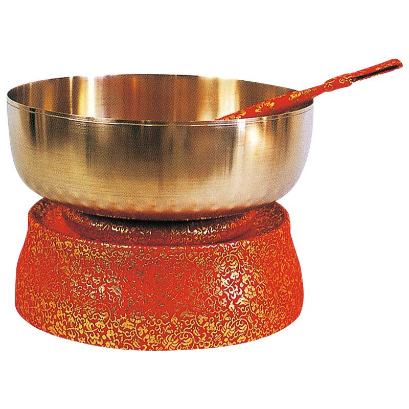真鍮製の梵音具には、鏧(きん)が挙げられ、鏧は「金子(きんす)」と書くこともあります。本願寺派では「大鏧(だいきん)」、大谷派では「経鏧(きょうきん)」と呼び、本山阿弥陀堂で使用される読経の前後や中間で打ち鳴らす仏具です。大谷派では、外陣で用いる経鏧の1/3程度の高さの平鏧という梵音具もあり、朝夕のお詣りや重要法要でも使用する汎用性の高い仏具があります。