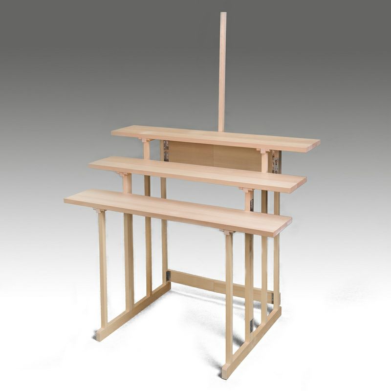 曲録には、組み立て式と折り畳み式があり、組み立て式は中国宋時代〔日本の平安時代から鎌倉時代〕の禅僧の肖像画「頂相図(ちんぞうず)にも描かれていることから、この時代の禅宗から発達したことがわかります。一方、折り畳み式は桃山時代から用いられた持ち運びの利便性を考慮されたもので、浄土真宗ではこの折り畳み式のものを「軽便曲録(けいべんきょくろく)」または単に「曲録」と言います。略式曲録とは、軽便曲録の手摺部分がないものを指します。