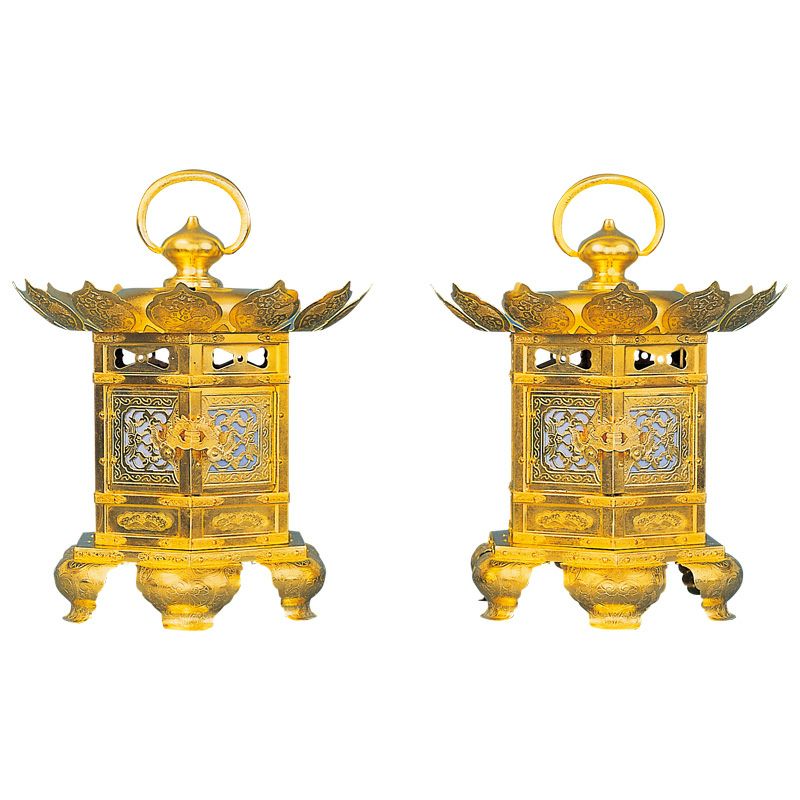 代表的な釣灯籠に、金灯籠が挙げられます。本願寺派は「かなどうろう」、大谷派は「きんとうろう」と呼び方に違いがあります。金灯籠の異称は「御面灯(ごめんとう)」と言い、堂内がうす暗い晨朝(じんちょう)や初夜(しょや)で、阿弥陀如来像や御影(ごえい)の顔を照らし参詣席から見えやすくしたことに由来します。