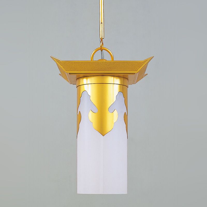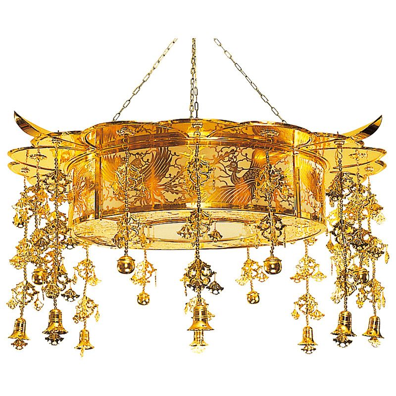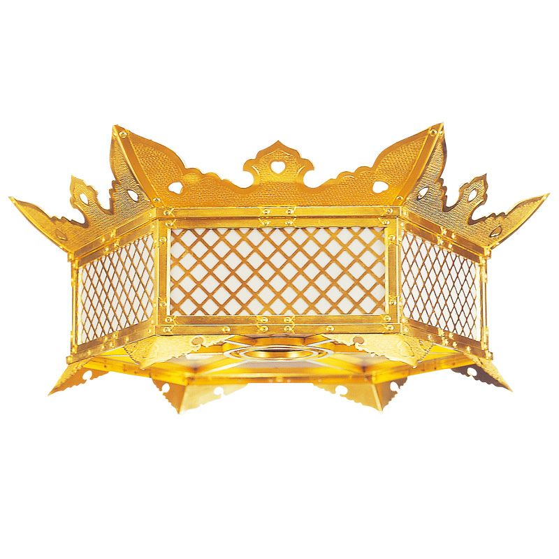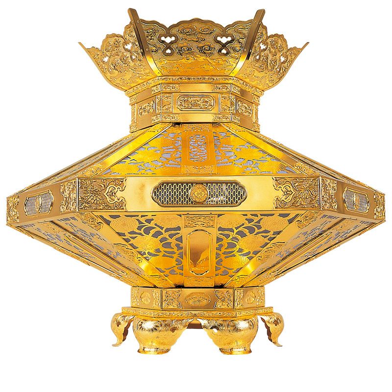 灯籠の火袋には菊唐草や宝相華などの透かし彫りが施され、灯籠は堂内を印象的に装飾する荘厳性の高い仏具と言えます。一方で、照明としての実用性が高い仏具が照明灯です。半菱型や丸型、八蓮型などがあり、いずれも底部には透過性の高いアクリル板を取り付け、仏堂内を明るく照らすとともに仏具としての荘厳性を兼ね備えています。その他、柱掛灯籠や柱巻灯籠も実用性と荘厳性を兼ね備えた仏具と言えるでしょう。