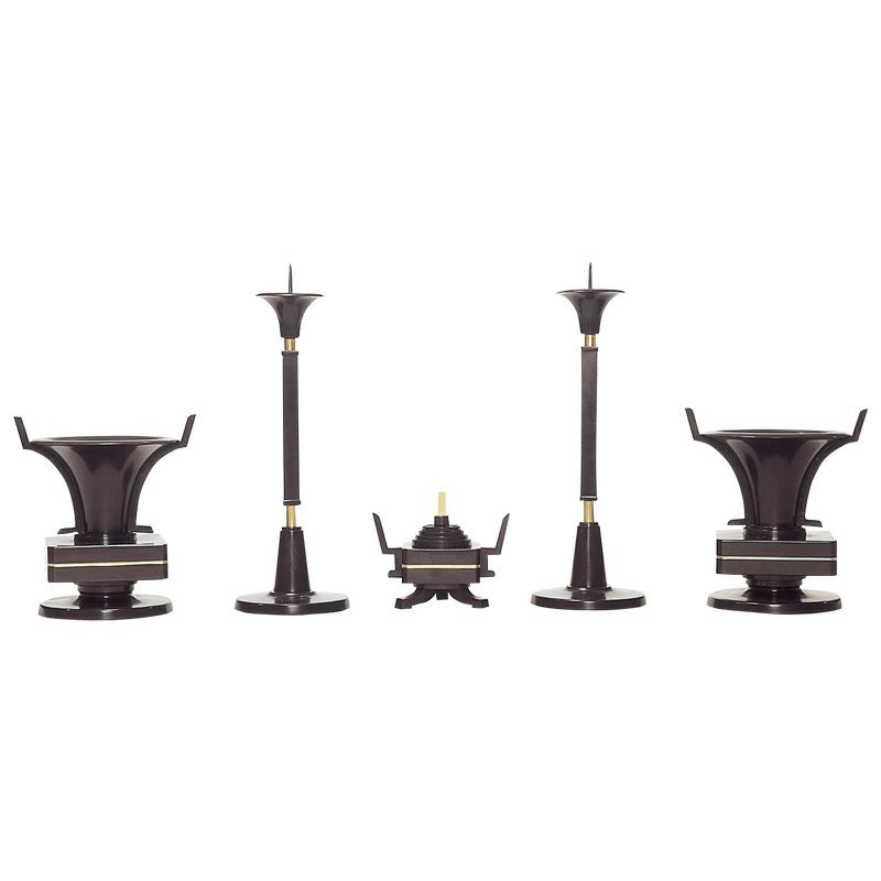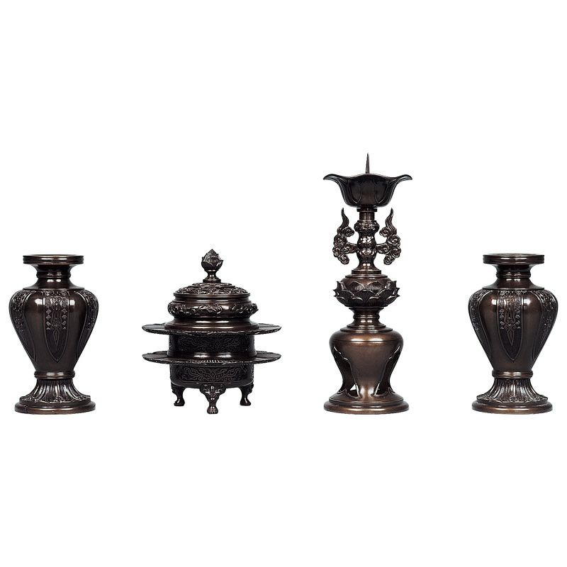 室町時代になり、中国から禅宗が日本に伝わるとともに、香炉・蝋燭立・花立をセットにした三具足を卓上で用いる手法が仏教諸宗派に広まりました。三具足の並びが、向かって右から蝋燭立、香炉、花瓶と決まったのは、室町時代中期、池坊専慶が華道における作法を決定していったことに起因します。
