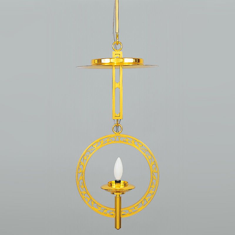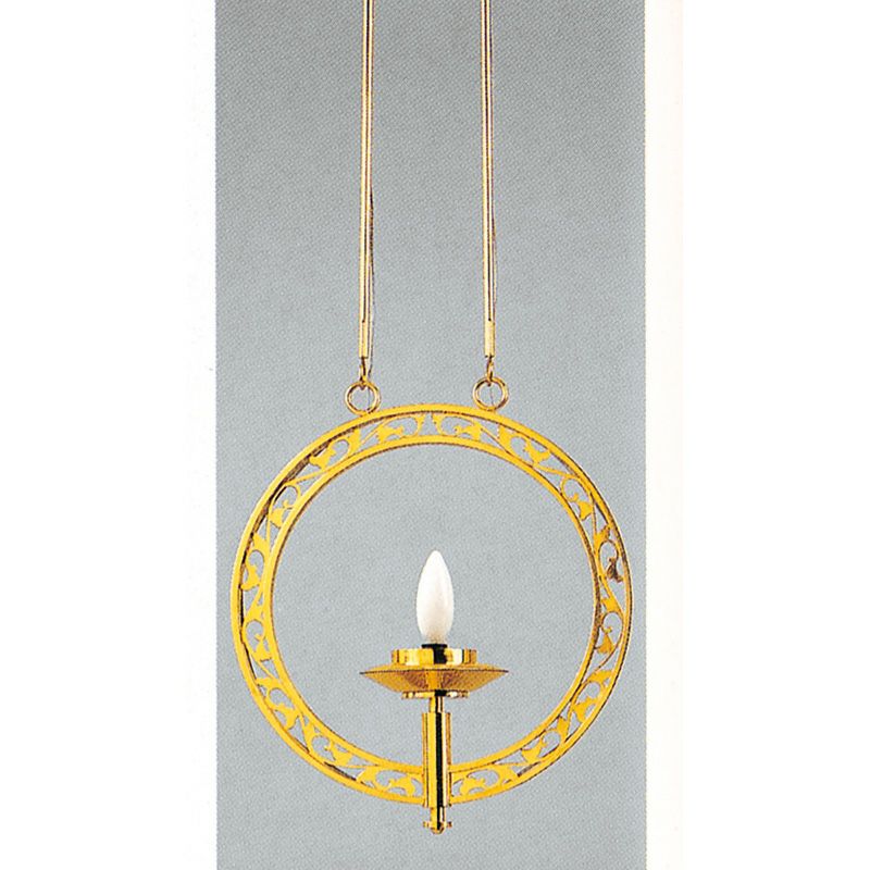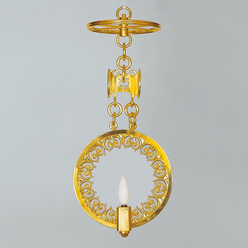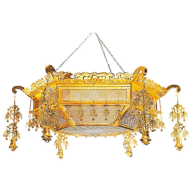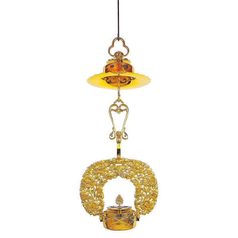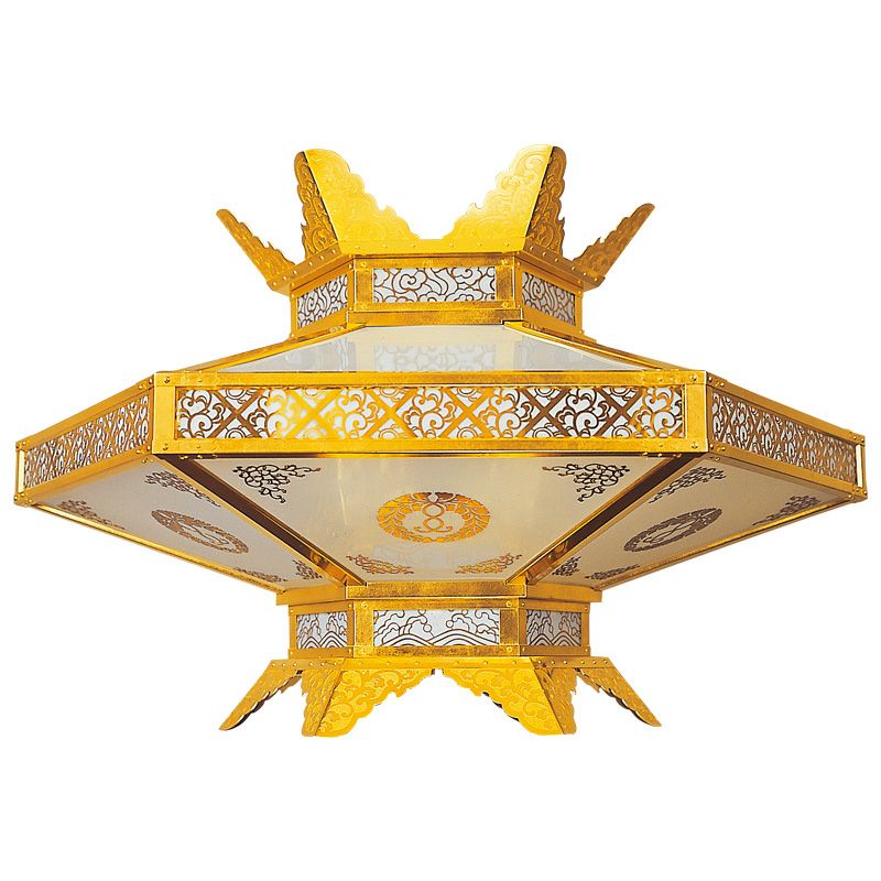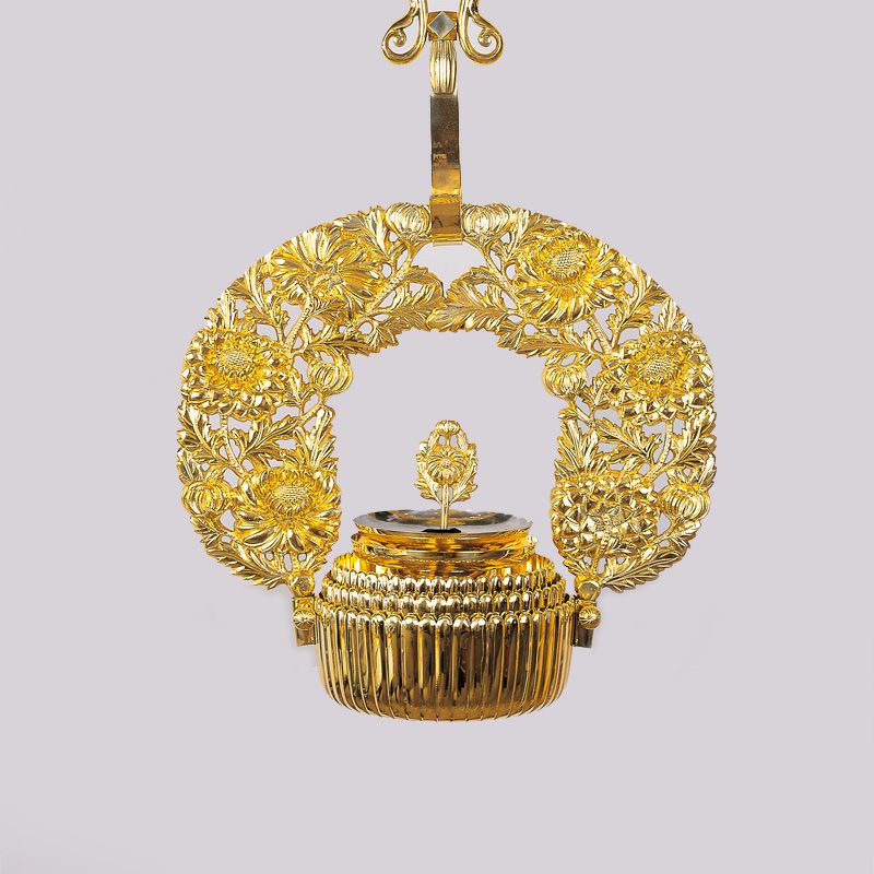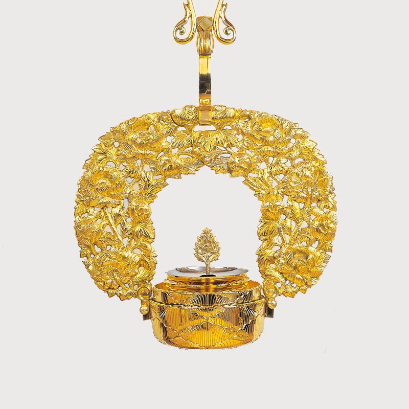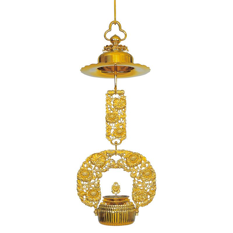 灯供養具の一つである灯籠は、大きく二つに分けられ、建物内部の床や地面に設置する置灯籠と、天井から吊るして使用する釣灯籠があります。浄土真宗では、輪灯という釣灯籠〔釣灯台〕が用いられますが、もともとは宮中紫宸殿(ししんでん)の照明器具だったものを、元和4年(1618)阿弥陀堂再建時に本願寺派第12世准如上人が取り入れました。菊灯も同様に、宮中の灯具を仏具に流用したものとされています。