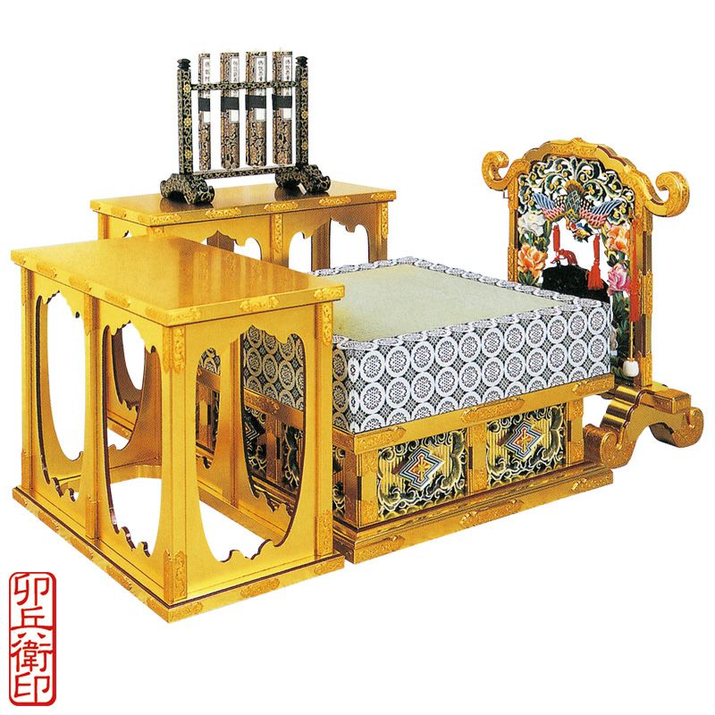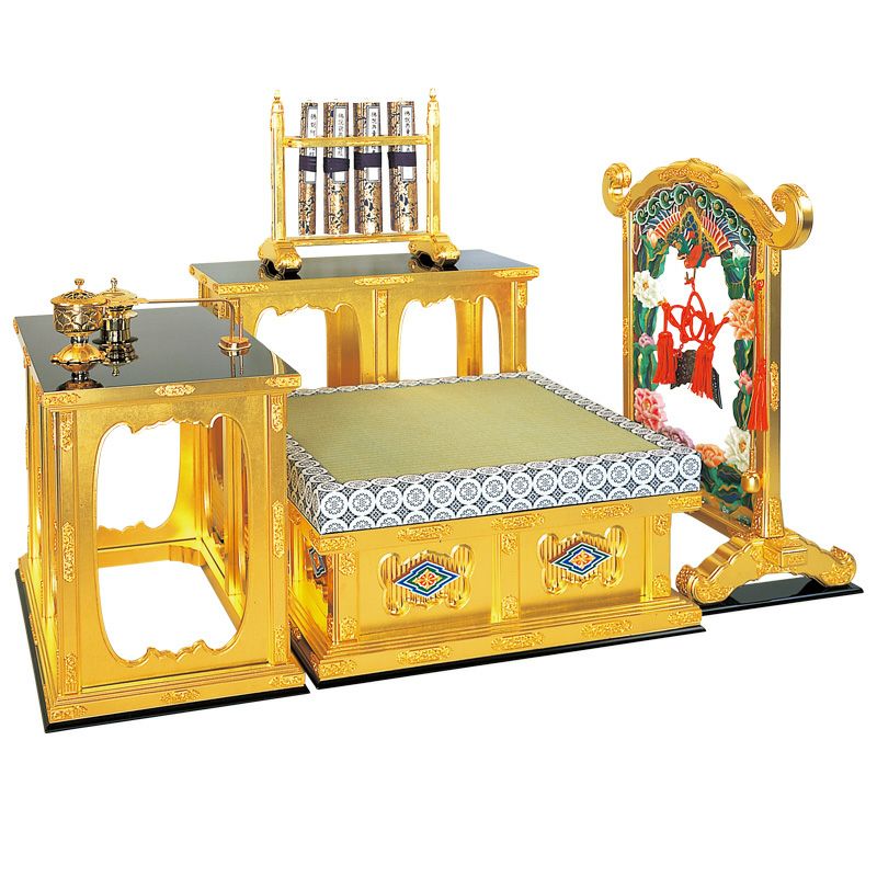 礼盤(らいばん)は仏を礼拝するために導師が登る高座のことで、須弥壇前に設置し導師が作法をする礼盤と、礼盤の前には経巻を置く卓、右手に磬台、左手に柄香炉を置く卓が設置され、それら一組を「礼盤一式」と呼びます。礼盤は、「牀座(しょうざ)」、「登高座(とうこうざ)」とも言い、密教諸宗派では「らいはん」と発音します。中国隋代の天台宗で礼盤の使用が確認されており、密教の伝来とともに日本へ移入してきたと考えられます。