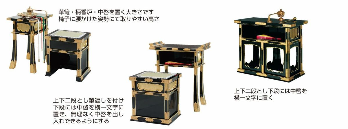 経典など典籍を収納した箱を乗せるための卓や台、具足や香炉などの供養具を乗せるための卓や台、天板に傷がつかないようにするためのアクリル板などを掲載しています。