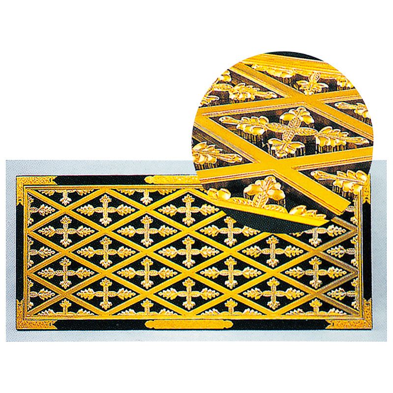 上壇下菱組彫物と団扇(だんせん)彫物は大谷派だけに使われる建具で、脇壇の正面立ち上がり部分の「蹴込(けこみ)」に取り付けられます。祖師前と御代前には菱組彫物を嵌め込み、余間には団扇彫物が取り付けられます。阿弥陀堂型と御影堂型の別があり、阿弥陀堂型には雲型や蝙蝠狭間(こうもりざま)の形に似たものもあります。