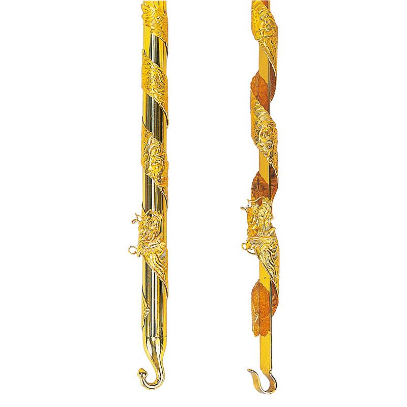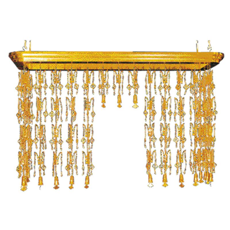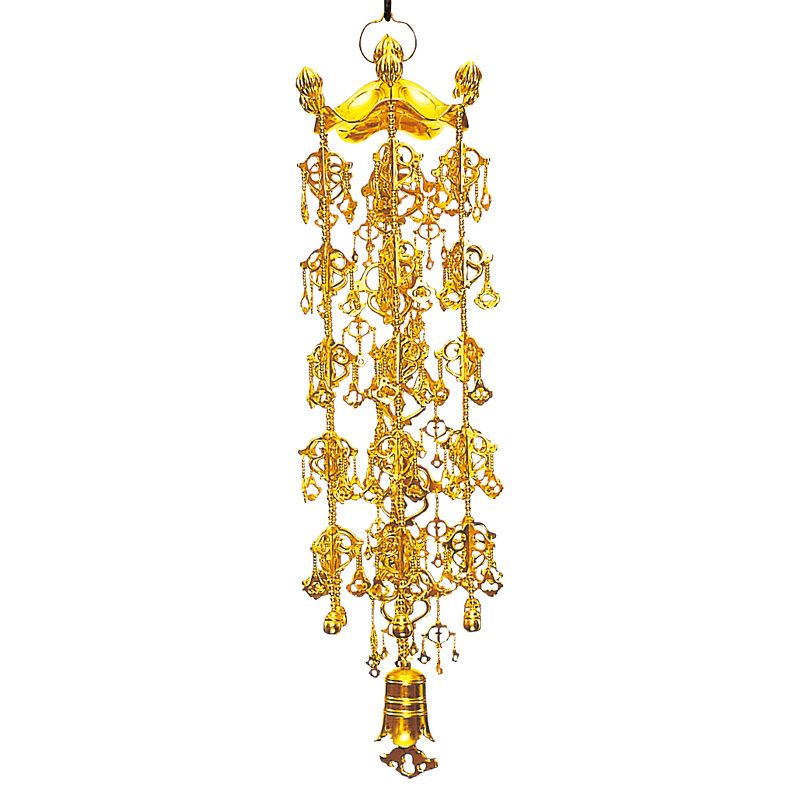 大谷派の瓔珞〔輪灯瓔珞〕は、一般寺院において中尊前と祖師前の前卓両脇に吊り下げた輪灯の上部を装飾する仏具で、重要な法要にだけ設置されましたが、現在では常設している寺院が多くあります。瓔珞下りの最下段は、阿弥陀堂型が風鐸のみ、御影堂型は風鐸と鈴が交互に取り付けられ、両堂の別があります。内陣天井の高さに合わせて三重笠と二重笠をご用意しており、中心の竿は丸竿と平竿の2種類をお選びいただけます。
