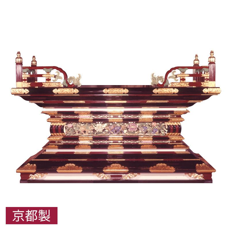 唐様通し彫型御須弥壇 唐獅子牡丹彫刻入 黒塗または朱塗 純金箔押 金具打 框横幅212cm