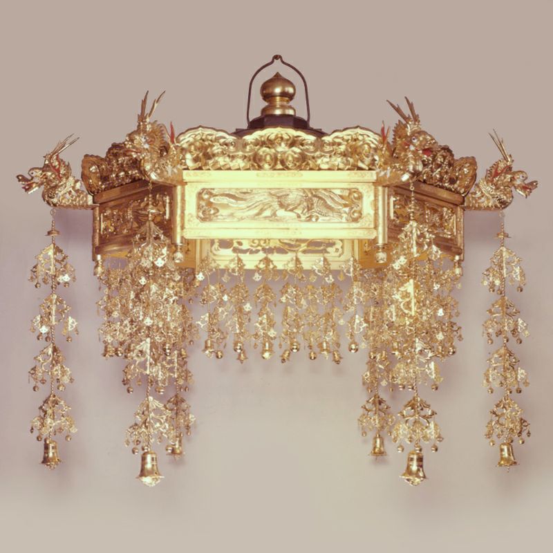 六角型人天蓋 柱付・総瓔珞下がり 純金箔押 金具打 笠対辺寸法136cm~91cm