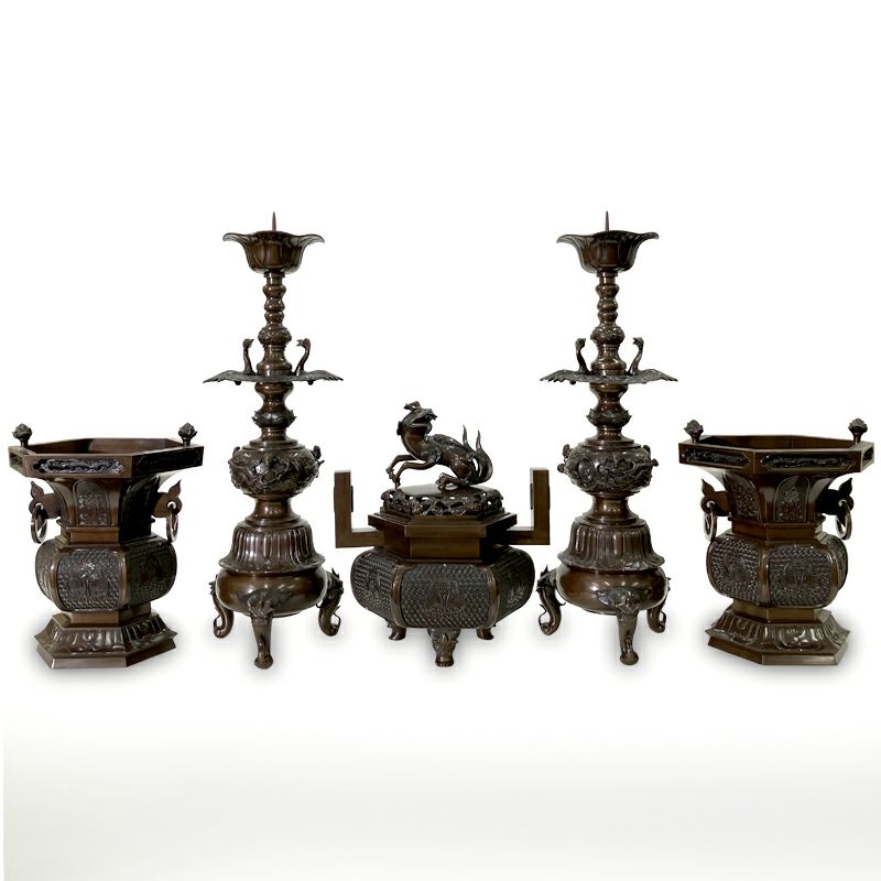 【アウトレット】五具足 御本山様式 花瓶六角型 落とし付 別製最上 蝋型鋳造 本願寺派 花瓶対辺27.5cm