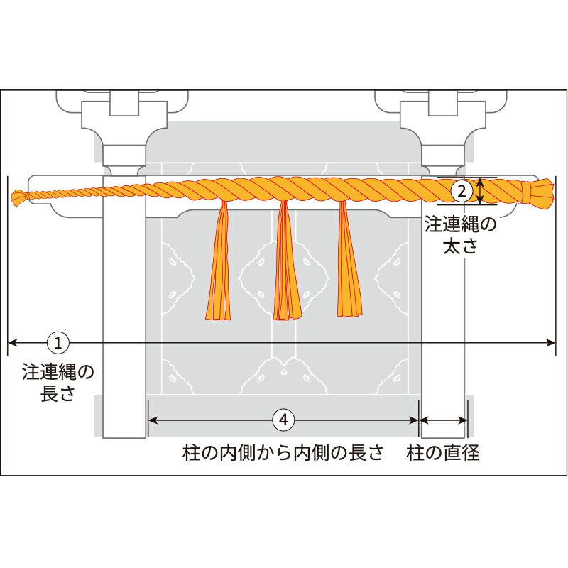 注連縄(しめなわ)の由来は天照大神が天岩戸から出てきたときに、二度と岩戸の中に入れないようにと張られた縄が由来と云われています。特別に撚り合された縄に紙垂(しで)と呼ばれる紙などを垂らしたものを、主に神域とその外側を区別するための結界として、また神の依り代として祀り、神社の周囲や神木などの御神体、神棚などで使用されます。素材には大麻(おおあさ)や出穂前の稲藁が使用され、繊維を左綯い(断面が時計回り)に撚り合わせた綯い方で製作されています(通常、農家などで綯う撚り方は右綯い)。左綯いで撚られた縄は横から見ると縄目が左側に上がっているのが特徴で、これは神道において(神様に向かって)右側を上、左側を下とするため、綯い始めが右側に来るように縄を張るのが正しいとされています(ただし、出雲大社や地方によっては綯い始めが左側に来る場合もあるため注意が必要です)。また紙垂(しで)を下げる際には神様の側が裏、表側が人の方に向くように取り付けます。これは神域に悪いものを寄せ付けないという意味があります。ちなみにしめ縄は「注連縄」と書きますが、この注連(ちゅうれん)は中国の由来とされ、家で死人が出た場合に家の門に張る縄のことを指し、後世、結界を意味するものとして当て字されたものと云われています。