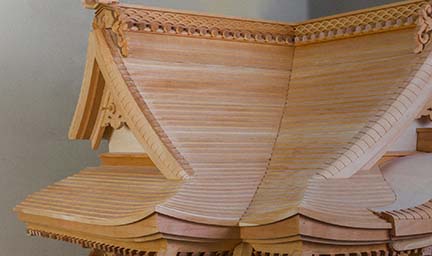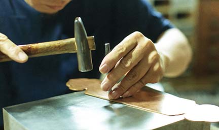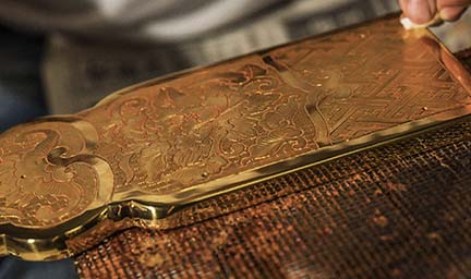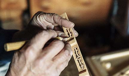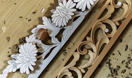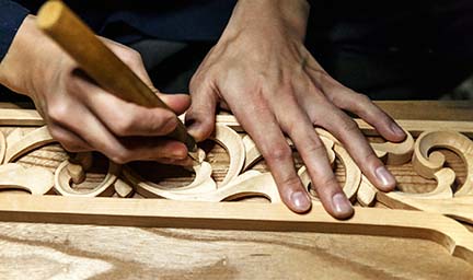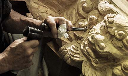 寺院用仏具や家庭用仏壇には、完成までに様々な工程と多様な職人の技を必要とします。木地に始まり、彫刻、漆塗、蝋色、金箔押、蒔絵、彩色、錺金具、そして金属鋳造や金属着色、掛軸などの表具まで、実に数多くの職人の仕事の結晶として、ひとつひとつ大切に作られ、心を込めて納めさせて頂いております。
